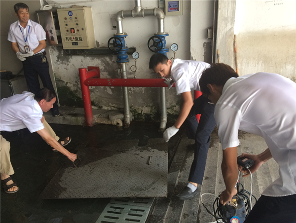 本次演练内容为地下停车场排水故障的应急处置。14时38分,演练正式开始。老市场D区车管员发现停车场西出入口发生排水故障,导致窨井水满溢,停车场地面积水,停车组组长立即用对讲机呼叫水电管理组并报告点位。14时40分,水电管理组组织5名水电工赶到现场,采取有效的应急措施,把移动式三相潜水泵放入窨井内,快速连接二支65型消防水带,插入电源启用应急泵排水。14时43分,地面积水经过水带排出104国道附道。