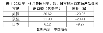 传统市场下降明显。一季度我国对美欧日传统市场出口家用纺织品38.63亿美元,同比下降18.64%,其中对美国出口下降20.05%,对欧盟出口下降20.41%,对日本出口下降6.56%。