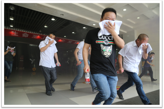 930分,随着消防报警声的响起,演练正式开始。模拟火情发生后,疏散引导员迅速到位,沉着冷静地指挥人员用湿毛巾捂住口、鼻,放低身体沿着墙壁快速、有序地沿消防逃生路线撤离到安全疏散集结点。服装市场与坯布市场微型消防站用极短时间迅速形成第一批灭火力量,并进行消火栓出水灭火救援。随后,集团公司专职消防队赶赴现场加入救援任务,展开疏散逃生搜救工作,并用消防车喷射水流灭火,区消防队官兵也紧随其后抵达火灾现场,实施喷射水雾灭火。在几支消防力量的集中攻克下,模拟火情迅速地得到了有效的控制和扑灭,全体人员安全逃生成功。