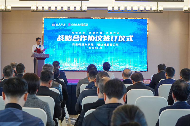 11月22日下午,轻纺城股份公司与柯桥区安昌街道在安昌街道开元观堂酒店三楼开元厅正式签署战略合作协议,合作成立服务领域更加广泛、智能管理更加完备的新型强村公司——绍兴市柯桥区风情安昌城乡服务有限公司,共同开启未来乡村建设新模式。区委常委、统战部长方优美出席签约仪式,安昌街道全体班子成员、各村(居、社区)主职干部、驻村指导员、街道共富指导员,轻纺城股份公司全体班子成员、轻纺城城市服务公司班子成员等参加。