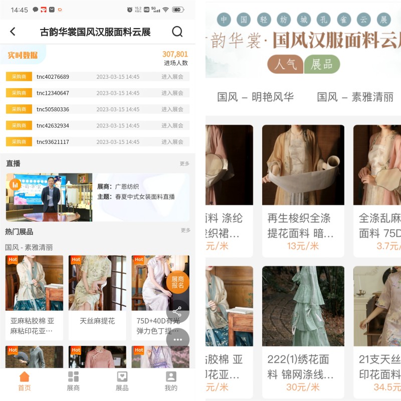 现如今国潮兴起,在《梦华录》《风起霓裳》等古风热剧的带动下,“汉服热”愈发升温,汉服美学备受年轻一代追捧喜爱,为持续助力轻纺城经营户国风原创面料的线上拓市与品牌打造,自去年起,公司已推出多场云展、月月新品的国风主题相关线上活动,本次展会汇聚了联合市场麦莎纺织、东市场石缘纺织、坯布市场云淑欣纺织等60家参展商,近千款国风汉服面料惊艳上线。