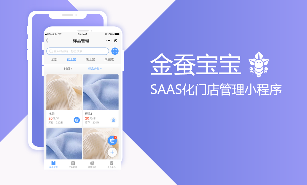 “金蚕宝宝”门店管理小程序,集样品管理、展示、条码管理、二维码/小程序分享、在线交易、发货管理等功能于一体,是帮助经营户线上拓市的重要工具。